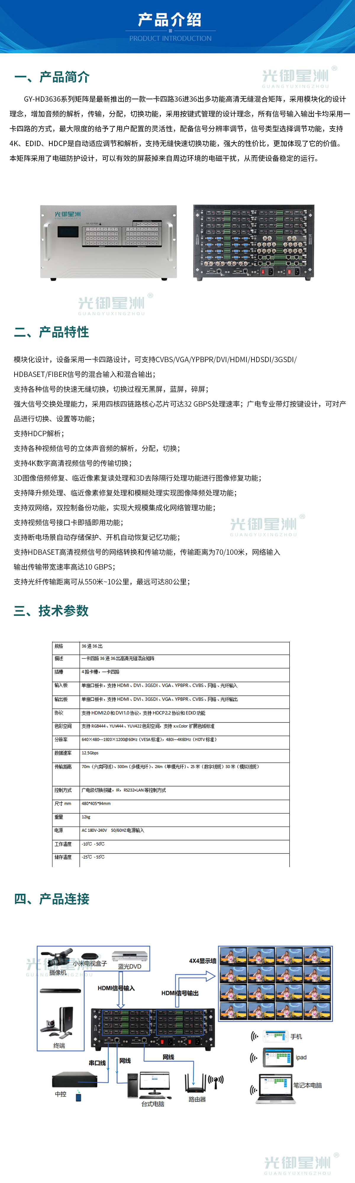GY-HD3636系列矩阵是最新推出的一款一卡四路8进8出多功能高清无缝混合矩阵,采用模块化的设计理念,增加音频的解析,传输,分配,切换功能,采用按键式管理的设计理念,所有信号输入输出卡均采用一卡四路的方式,最大限度的给予了用户配置的灵活性,配备信号分辨率调节,信号类型选择调节功能,支持4K、EDID、HDCP是自动适应调节和解析,支持无缝快速切换功能,强大的性价比,更加体现了它的价值。本矩阵采用了电磁防护设计,可以有效的屏蔽掉来自周边环境的电磁干扰,从而使设备稳定的运行。